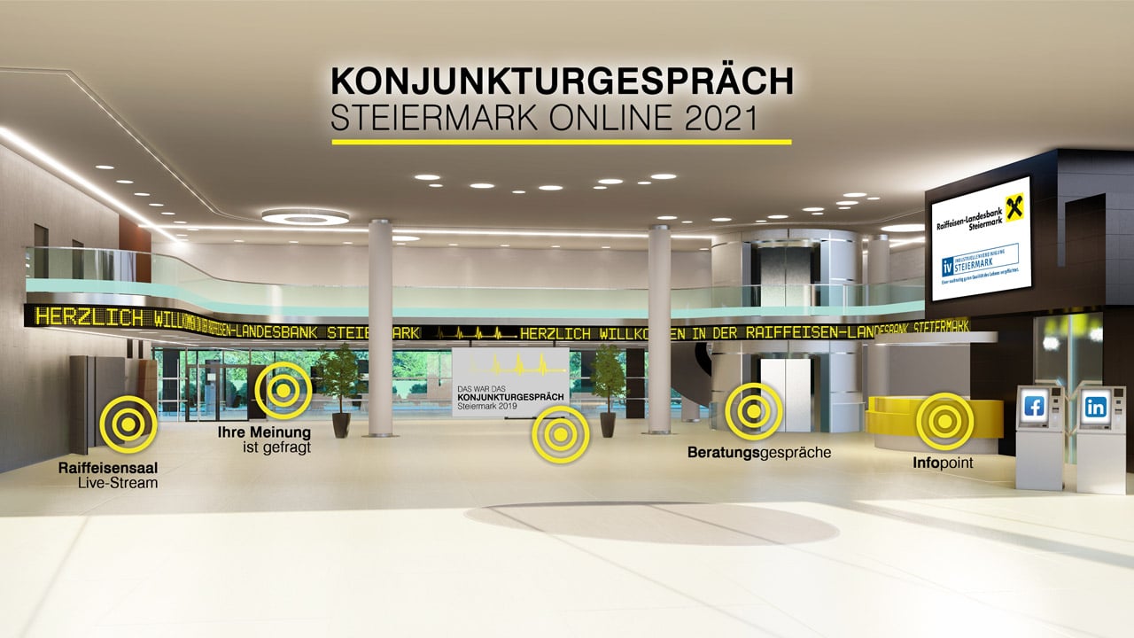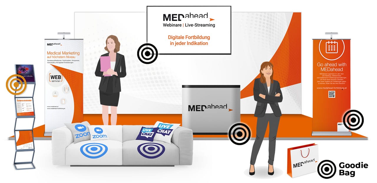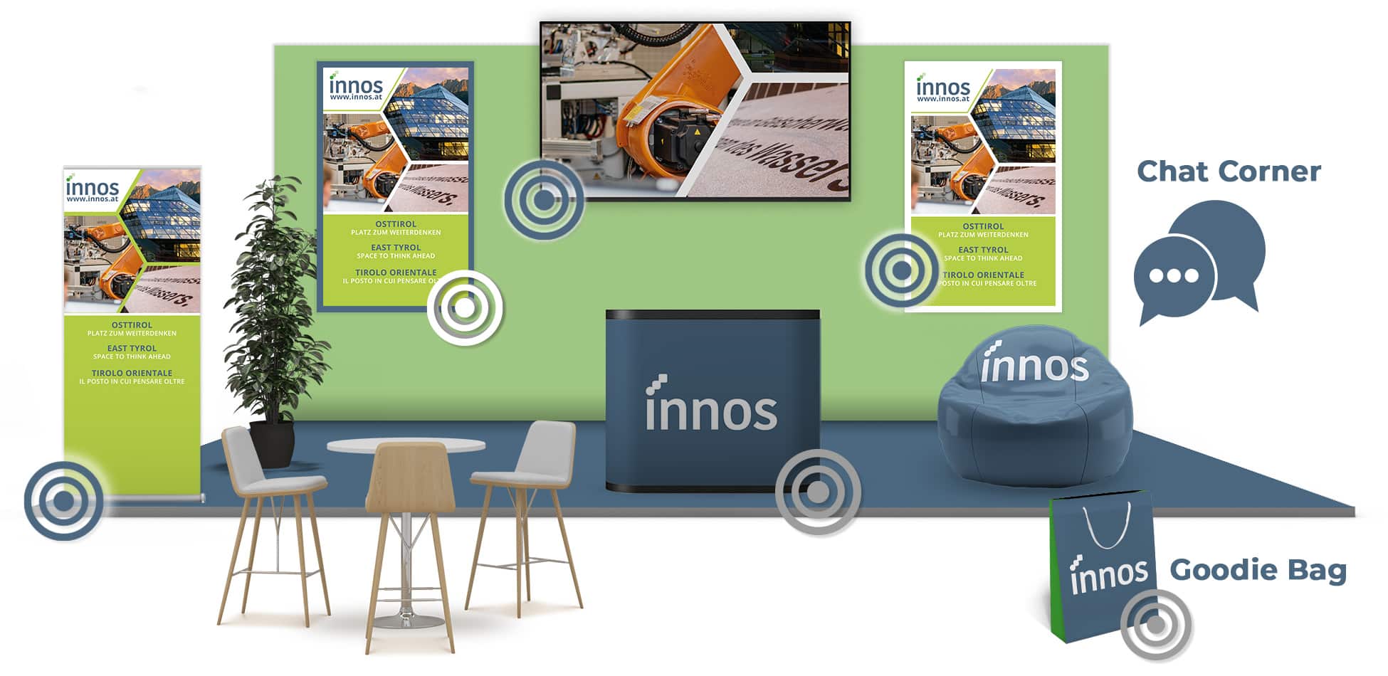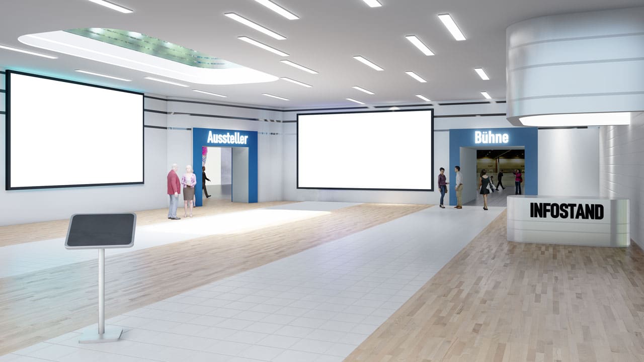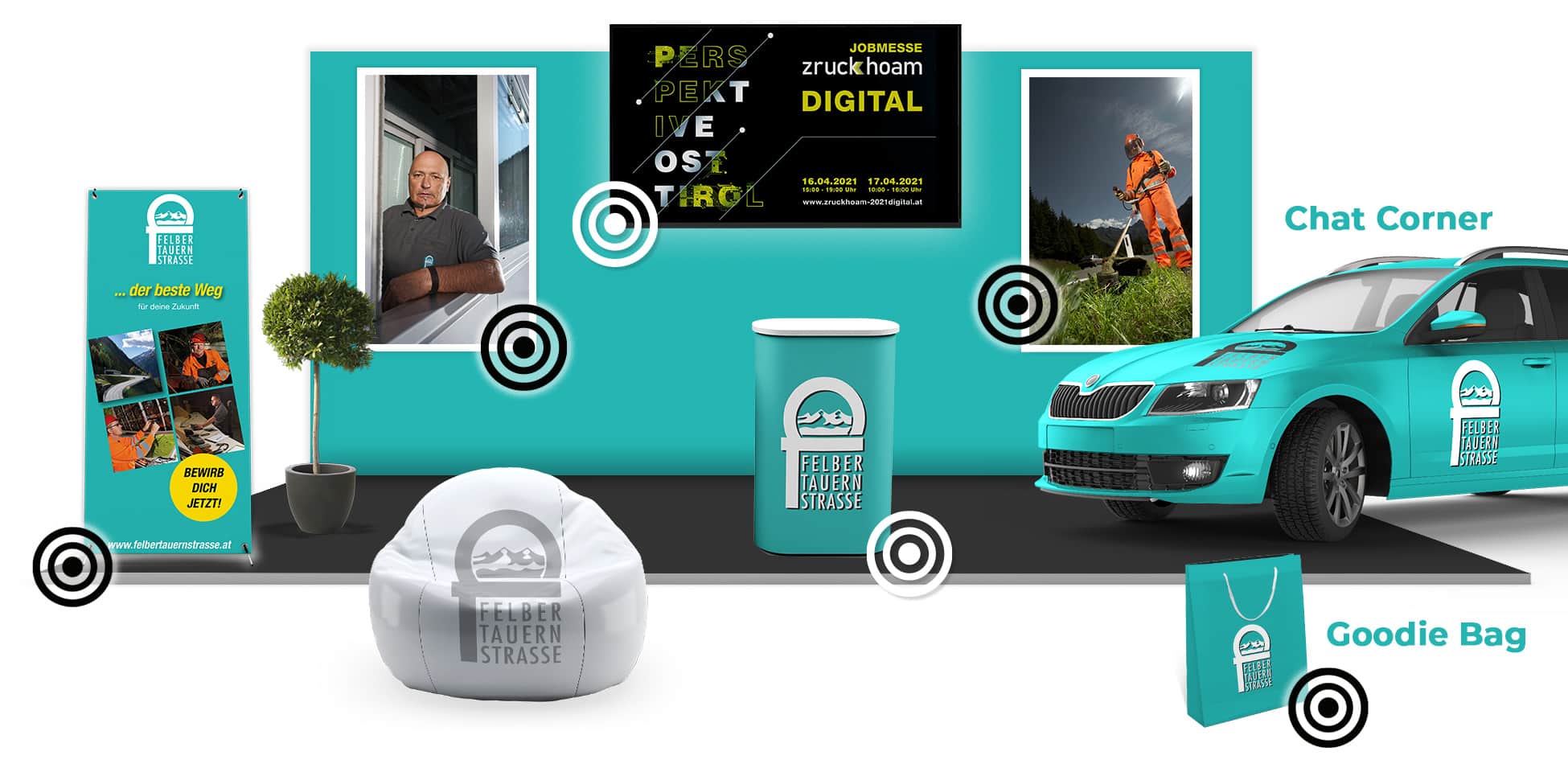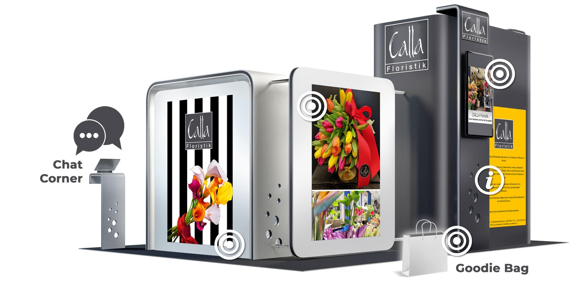Individuelles Design Ihrer digitalen Ausstellungsfläche – Die interaktiven Elemente führen durch Ihren Ausstellungsstand. Ob das Roll-Up mit Bilderkarussell, der Katalog/Prospekt in digitaler Form zum Download, ein Produktvideo/Imagevideo, ein persönliches Gespräch Face to Face via Zoom oder Microsoft-Teams oder sogar das beliebte Goodie Bag für Ihre Kunden.